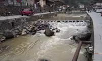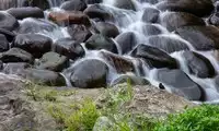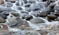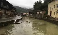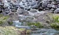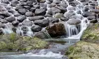 A village built by a stream, the stream flows through the pebble riverbed, the water is clear and you can see the bottom.