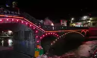 There are people selling fireworks by the bridge. Taking a fireworks portrait together is the best way to please girls.