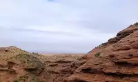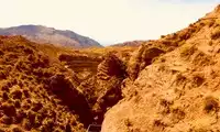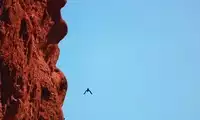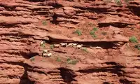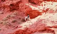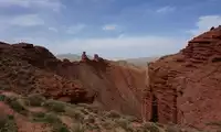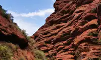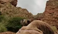 Pingshan Lake Grand Canyon is a very interesting place. Although it is dry and rainless, I occasionally encountered camels, lambs, flying birds, rabbits, and lizards along the way. The red canyon is full of gullies and green grass, and there are wet water marks in the deepest part of the canyon.