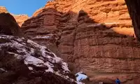 The soil in the canyon is dark red, dotted with snowflakes. The red soil and the white snow are well matched, like a huge and magnificent landscape painting. In fact, the canyon is a very romantic place. After millions of years of baptism by time and nature, it is full of gullies, steep and dangerous, deep and quiet, and stretches endlessly. It is not only a desert, a mountain, a deep valley, but also a long river. What's more important is that you can see the wind, the snow, the mountains, the lakes, the sun, the moon and the stars passing by.