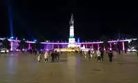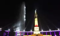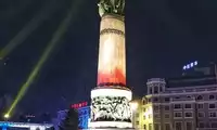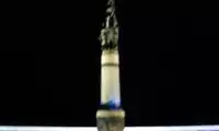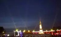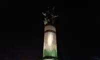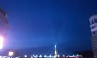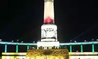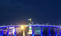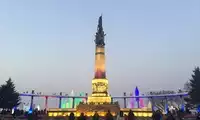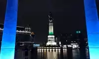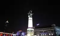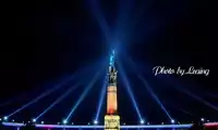 The memorial tower at night is in the downtown area and is crowded with people. Everyone is releasing lanterns on the ice and making New Year's wishes.