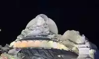 As night falls and the lights come on, we journey into the romantic Snow Town, a beautiful place reaching into the clouds. There's even a statue of Buddha on top of the snow sculptures. If the surrounding fog were thicker, you'd think you were in the Sky Palace. Can you make out any of the buildings inside? I only recognize a few. There's the pagoda of Li Jing, the Heavenly King of the Pagoda, and the ancient Roman Colosseum.