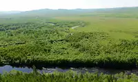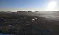 On the other side of the wetland are the forests of Daxinganling and the Jiamo Highway that passes through it.