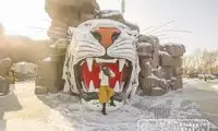 The tiger sculpture outside is very cartoon-like, with a model of a tiger's mouth. Many children are taking pictures in the tiger's mouth.