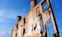 Before I could even enter, I'd been circling the ruins. Not far along the abandoned railway, I looked up and saw it, but the iron gate was locked. It was the former power section boiler room of the headquarters, destroyed by Japanese bombing, leaving only this remnant wall.