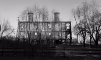 After leaving the headquarters building, the former experimental building, the Square Building, no longer exists. The iron gate of the boiler room in the distance is open during the museum's opening hours, so I came here again. There used to be three chimneys, but the middle one has been destroyed.