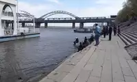 There were many people sitting on the bank of the Songhua River. The bridge had not been built yet.