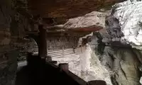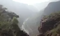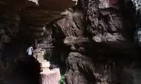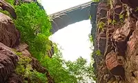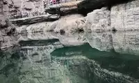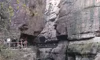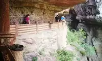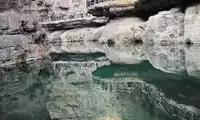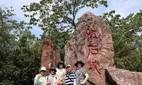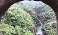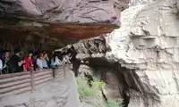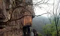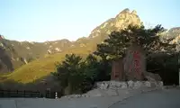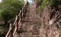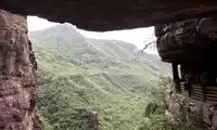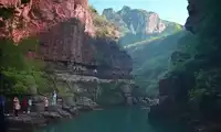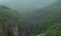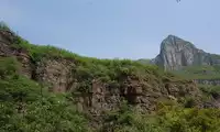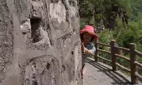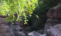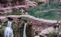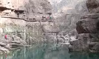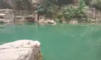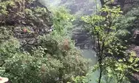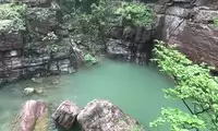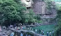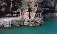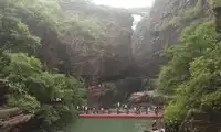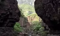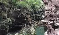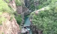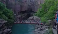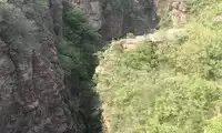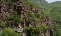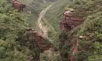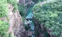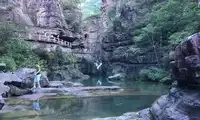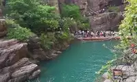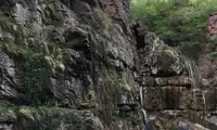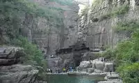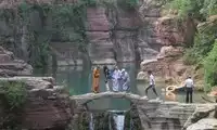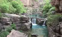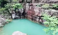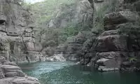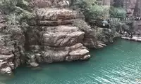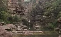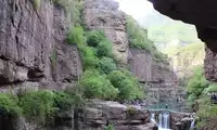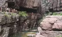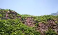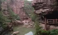 The valley is cool and pleasant in summer, and moss and grass grow green in winter, so it is called Hongshi Gorge. The valley is distributed with "White Dragon Pond", "Yellow Dragon Pond", "Green Dragon Pond", "Black Dragon Pond", "Wolong Pond", "Mianlong Pond", "Xinglong Pond", "Zilong Pond" and "Youlong Pond", forming "Nine Dragon Stream". There are also landscapes such as "Secluded Waterfall", "Crossing Stone Cave", "Kissing Stone", "Double Lions Drawing Water", "Peacock Spreading its Screen" and "Chess Plate Mountain". At the south end of the valley entrance, there is a narrow canyon called "One Line Sky", and there is a Bailong Waterfall with a height of more than 50 meters. The high mountains on both sides are like a stone que, which happens to be the west gate of Yuntai Mountain.