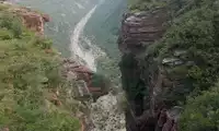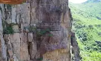The mountains in the north are indeed different from those in the south. The mountains in the south are beautiful and spiritual. The mountains in the north are strange, dangerous and majestic. Looking down at the canyon, the cliffs are bright red. At the bottom of the canyon, there is a gurgling stream that gradually converges into a small river. The plank road on the cliff