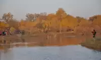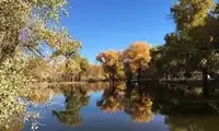 From one end to the other, we passed the first and second bridges in Ejina Banner. The poplar trees were beginning to shed their leaves slowly, but the water color still reflected the different colors of the poplar trees.