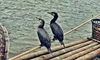 These boatmen use bamboo poles to hold cormorants for tourists to watch. I was wondering how they make money by holding cormorants like this. It turns out that they invite tourists to hold bamboo poles and take photos with cormorants. Each time, they charge 10 yuan until you are satisfied with the photo.