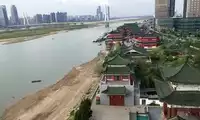 The view from the top floor is quite good, with a panoramic view of the high-rise buildings across the Ganjiang River. However, since it hasn't rained in Nanchang for a long time, the water in the Ganjiang River has become much shallower.