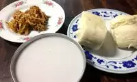 Finally arrived at Xianfeng Temple. I started climbing at 12:00 PM and arrived here a little after 6:00 AM. Yuxian Temple still had over an hour to go, and it was raining, so I decided to stay here. Behind the temple is Jiulao Cave. The main hall of Xianfeng Temple is the God of Wealth Hall, where you can worship the God of Wealth. I heard from locals that it's a frequent visitor. Here's the Xianfeng Temple breakfast, 10 yuan per person. Three all-you-can-eat items: kimchi, steamed buns, and porridge. The steamed buns were really filling and delicious, without any leavening agents. I was completely stuffed after eating three.