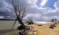 There are many popular photo spots along the Erhai Lake, including colorful jeeps, glass ball swings, etc. The fee is 10 yuan. We took a few (dozen) photos there, haha. Then we walked along the lake, stopping and starting. Many people were taking wedding photos. The lake was very clear, and the wind blew up layers of ripples. Many seagulls flew in from time to time. After walking along the lake for a while, we found a very beautiful scenery. The lake was shallow, and the stones at the bottom of the lake could be seen. Some plants similar to water plants were washed to the shore, forming a thick layer. Several dead trees of different shapes stood far away, giving a sense of quietness and loneliness. Just looking at the distance quietly, listening to the sound of the waves, and being in a daze for a while is a very happy thing.