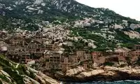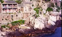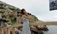 The bay under the stone houses is very beautiful, a pleasing blue. Tourists are taking their children to play in the water. Behind them are deserted houses that have been abandoned for a long time. The overall picture is surprisingly harmonious.