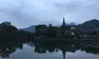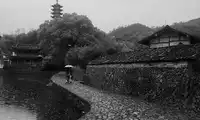 In the rainy ancient town, curls of smoke drifted from somewhere, mingling with the mist and floating on the lake, creating a dreamlike scene. The pebbles on the paths, washed by the drizzle, gleamed brightly. The ancient village still retained its ancient pavilions and towers. The steady drizzle didn't dampen our spirits.