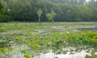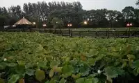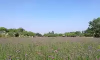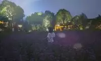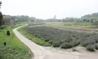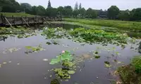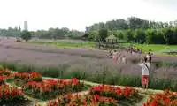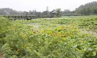 The Dragon Field gets its name from its shape, which resembles a crouching dragon. The field is dotted with lotus flowers, some about to bloom, others blooming in a lovely pink, translucent hue. Large dewdrops adorn the lotus leaves, and the expanse of green contrasts with the purple of verbena and sage. The chirping of cicadas creates a summery atmosphere. A cobblestone path separates the verbena and sage fields, and the path is quite muddy. Standing at the edge of the field, one feels as if one has departed from a small, waterside town.