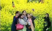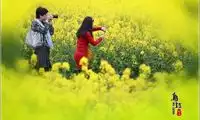 The golden rapeseed flowers are in full bloom in the dragon-shaped field. Tourists walk through it, and the green and red clothes are dotted in it.