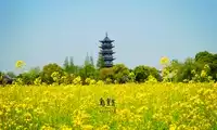 It is said that the Dragon Shaped Field got its name from its shape which resembles a sleeping dragon. You certainly cannot see it when standing on the ground. You may be able to see the shape of a dragon if you find a high place. In fact, it doesn’t matter whether it looks like a dragon or not. The key is that different crops are planted here in all seasons, such as rape flowers, sunflowers, chrysanthemums, etc. The patches of flowers attract tourists and make it a famous tourist attraction. When we went there, it was the rape flower season. The bright yellow rape flowers and the pale purple February orchids bloomed all over the Dragon Shaped Field. From another angle, the White Lotus Tower in the distance became an excellent background. It is not far from here to the Three-Inch Golden Lotus Pavilion.