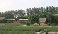 In the Xizha Scenic Area, the Dragon-Shaped Field, named after its shape resembling a sleeping dragon, features thatched cottages, pavilions, lotus ponds, irrigation wheels, swings, and a sea of purple flowers.