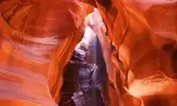 Antelope Canyon is located not far southeast of Page, on the Navajo Indian Reservation. It is located in a perennially dry river channel and is divided into two independent canyons, the upper and lower canyons.