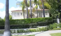 This beautiful villa is located in a famous wealthy area in the United States. It has a blue sky, warm sunshine, and beautiful views in front of the gates of various shapes.