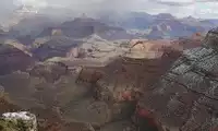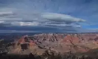 The magnificent Grand Canyon unfolded before us without reservation. The setting sun shone on the canyon's summit, emitting a vibrant red hue, while the shadows appeared dark gray, creating a strong contrast that enhanced the overall image. At the bottom of the canyon, the Colorado River flowed slowly like a gentle stream. The drifting clouds in the sky made the sunlight appear and disappear, painting the canyon with a magical hue.