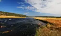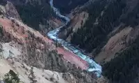 The river flowing from Yellowstone Lake flows through a roughly 38-kilometer stretch, creating a precipitous canyon commonly known as the Grand Canyon of the Yellowstone. The Yellowstone River, a mere 97 kilometers long, is known as "the only river in the United States without a dam." Here, the river suddenly surges, creating a powerful spray that creates two magnificent waterfalls that roar into the Grand Canyon.