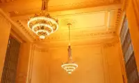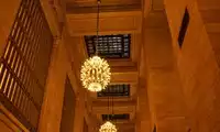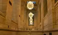 Grand Central Terminal opened on February 2, 1913, constructed with a massive expanse of granite. Its interior concourse is magnificent and captivating, stretching 275 feet. It has appeared in numerous films, including Madagascar, The Avengers, Superman, and X-Men. The ceiling of Grand Central Terminal is decorated with the zodiac signs. While beautiful, it contains numerous astronomical errors. Perhaps Grand Central's most iconic feature is the four-faced clock in the center of the concourse. Constructed of brass, its dial is made of precious opal. It's said to be worth well over $10 million! Why bother robbing a bank? Take this home and you'll be rich! Beneath the clock is a popular meeting place for many New Yorkers. Furthermore, the time displayed on the clock is actually one minute ahead of the actual time, preventing people from being late and missing their trains. I thought to myself, with someone like me who has no sense of time, even ten minutes ahead wouldn't guarantee it. Another attraction in the concourse is the beautiful 24-karat gold-plated chandeliers, each containing 110 bulbs.