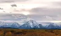 From the Titon Park turnout, you can see a panoramic view of the five Teton peaks. The Teton Mountains rise quietly in the distance, while the Snake River at their foothills appears and disappears amidst a forest. The yellowing leaves of the trees curve like a yellow ribbon, creating a vibrant contrast at the foot of the mountains. Beyond the trees lies the vast expanse of grassland, already turning yellow by the end of September, yet possessing a desolate and bleak beauty.