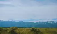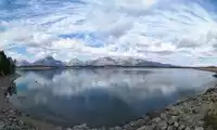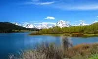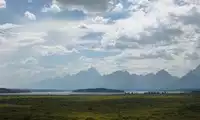 Grand Teton National Park. Passing a hotel filled with stuffed brown bears and swans, we arrived at the observation deck. The scenery here is as beautiful as an oil painting. Nearby, low green shrubs lead to muddy yellow-green grasslands, which then connect to the clear waters of Jackson Lake. In the distance, mountains stretch out in a continuous line, with unmelted snow still visible on some peaks. Everything, framed by a blue sky and white clouds, looks like the work of a famous artist, or something from a dream.