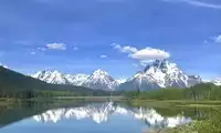 Grand Teton National Park, established in 1929, covers 126 square kilometers and is located in the spectacular glacial mountains of northwestern Wyoming. The park's highest peak, Grand Teton Peak, stands at 4,198 meters, and features glaciers that still exist today. Among the glacial lakes scattered throughout the area, Lake Jenny is the most famous. Jackson Lake, formed by the damming of the Snake River, is the largest body of water in the area. Grand Teton National Park is renowned for its continuous snow-capped peaks, stretching over 200 miles along the Grand Teton Range, with the Snake River flowing through the park. The park's towering snow-capped mountains, vast grasslands, pristine lakes, and abundant wildlife all create a breathtaking spectacle.