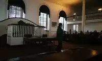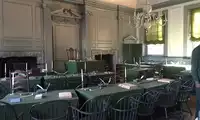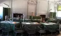You need to make an appointment and enter the hall at the designated time. First, go to the visitor center to make an appointment and get two tickets with the visiting time and a visiting map. The visit to Independence Hall needs to be led by a tour guide, and the number of people entering at each time is controlled, about twenty or so. After entering, you will first watch a short film in a place similar to a conference room, and then the tour guide will continue to explain and interact with visitors. Follow the tour guide to visit the place where the Declaration of Independence and the Constitution were signed. The interior furnishings remain the same, with 13 tables arranged in a semicircle, representing the 13 colonies. The table is covered with the green velvet tablecloth of that year, a silver inkstand, goose feathers for writing, and candles for lighting.