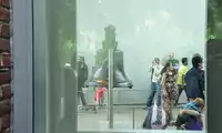 However, you need to queue up to get your ticket. It's at the Visitor Center on 6th Street, north of the Liberty Bell. You need to get there early because the number of visitors per day is limited. So, I recommend lining up for Independence Hall tickets in the morning. There's a group of people every 15 minutes, and there are guided tours. For example, we arrived at the Visitor Center at 9:30, and they told us they'd be asking if we wanted to go at 9:45, so we got the 9:45 tickets. It's a one-block walk from the Visitor Center to the Memorial Hall, and it takes about 5 minutes to walk across the Liberty Bell Plaza. Then there's security.