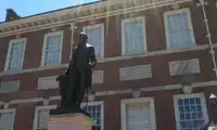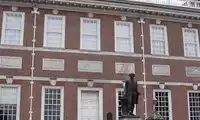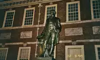 The image is the same as the US$100 bill, the largest US currency. To visit Independence Hall, follow a local guide and purchase a ticket through the small door on the left. Standing in front of the hall is a statue of General George Washington.