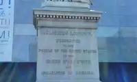 In front of Independence Hall stands a statue of General Washington. The general, dressed in a black robe, stands tall on the top of the stone tablet, his eyes piercing and his spirit shining.