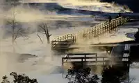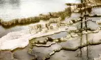 From a distance, Mammoth Hot Springs resembles a glittering, crystal-clear mass of gold and jade. The hot springs form a series of beautiful, multicolored steps along the hillside. This area is the only tourist accommodation in Yellowstone National Park accessible by car in winter.