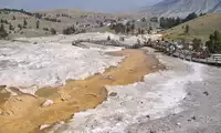 The terrain here is high, and the entire Mammoth Village is nestled in a valley. From afar, the Mammoth Hot Springs are awash in steam. Follow the wooden boardwalk at the foot of the mountain to the Lower Terraces observation deck. From there, continue up the path to the Upper Terraces observation deck at the summit. The ground at the summit is covered in deposits of lime and sulfur, giving it a snowy whiteness, tinged with sulphur and iron.