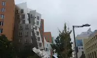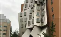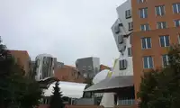 The science and engineering majors that students like me at Jiaotong University aspire to pursue. The most striking building on the MIT campus is a masterpiece by master designer Frank Owen Gehry. At first glance, it looks a bit odd, like a random assemblage of building blocks, a truly spontaneous design. From every angle, the building's sharp, triangular elements are visible, yet it feels as if it's about to collapse. Because of the holiday, we weren't allowed inside the teaching building. It's said to be filled with sculptures and paintings, making it sound more like a modern art gallery.