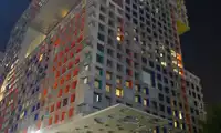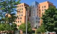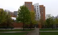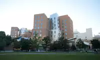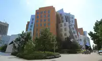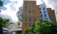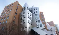 Another of my favorite buildings on the MIT campus is this incredibly unique-looking building. Actually, it's just a dorm for MIT undergraduates. It's got a very tech-inspired feel, a bit like the polymer pore structure Beidou studied. Inside, there's a small theater, a nighttime cafe, and a restaurant. Each dorm room has nine windows that switch on and off. The tint of the windows changes depending on the angle of the sun, providing heat to the building and saving energy. Since it's a student dormitory, it's not open to the public. If you're brave enough, you might want to wait for students returning to their dorms at the door and ask them to show you inside.