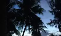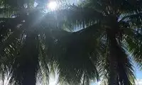The sea here is very colorful, with large coconut trees and people surfing on skateboards. It's a standard island setting!