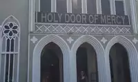 The Spanish-style Catholic church is on the roadside. Take a look at the exterior.