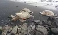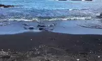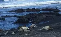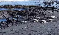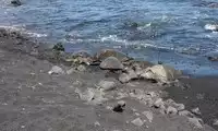 There are so many sea turtles in this sea, and there are many of them lying on the black sand beach. They are very big, lying lazily, in a large group.