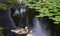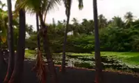 The drive from Volcano Village to the Black Beach took about half an hour. Our stay on the Big Island was mostly rainy, with thick clouds obscuring the sun. The temperature was perfectly suitable, but the photos were all gray and dark. Yanyan loved the black beach and started playing in the sand. I didn't rush her, wanting her to have as much fun as possible, even sacrificing the rest of the program. On sunny days, sea turtles often appear at the Black Beach, lazily basking on the sand. Yanyan was very interested in the display board about sea turtle protection and asked me to explain it to her. We were enjoying the gentle sea breeze when we suddenly noticed a small pond behind the black beach. It was filled with water lilies, and a few fearless wild ducks were playing on the shore. If it hadn't been for a light rain, we wouldn't have left.