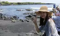 Black sand beaches are rare in the world. The sand here is formed from volcanic lava fragments, giving the beach a deep, inky black color from afar, with the black sand gleaming in the sun. The scenery itself... the highlight is the black volcanic sand, which is incredibly hot, so wearing shoes is essential to avoid burns. Sea turtles crawl around there, unmoving, unfazed by the burns.