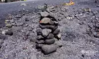 This village was destroyed during the 1990 volcanic eruption, which wiped out over 100 homes. The circular area is where the destruction occurred, so out of respect, it's best not to go inside. The destroyed area is surrounded by stones, forming a ruin. To show respect, place a stone on the pile of stones in front.