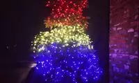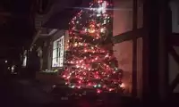 It was late at night and there were few people on the streets, but the streets were decorated with lights, giving the town a festive atmosphere.