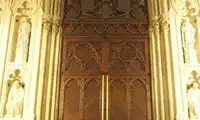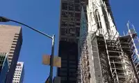 Saint Patrick's Cathedral, a renowned Gothic structure on Fifth Avenue, is undergoing renovations. Its ancient, heavy copper doors and stone walls exude a sense of texture.