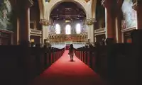 The campus is unfenced, allowing all visitors to explore freely. Traffic and pedestrians are sparse both inside and outside the campus. The vast Stanford University lies like a giant, resting beneath a clear blue sky and emerald green fields, basking in the warm sunshine, resting and recuperating after a long and tiring life. Upon entering the campus, one is greeted by a Christian church. The exterior walls are vibrantly painted with biblical stories, adding a touch of life and energy to the quaint building. It is said that this church was built by Mrs. Stanford in memory of her husband, who passed away peacefully. The first floor is open to the public, but on European and American holidays, churches are always a popular venue for wedding ceremonies. Several handsome couples in wedding attire, surrounded by guests, fill the aisles, bustling with photos.