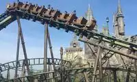 I heard the roller coasters here are the best and have the longest lines. I saw one outside the castle and rushed over, but it ended before it even started! It didn't match the guide! I got down and saw it wasn't the real one; the real one was inside the castle. After storing my bags, I lined up to get in, and it was our turn pretty quickly. The special effects on the ride were amazing, and I was still wanting more after it ended.